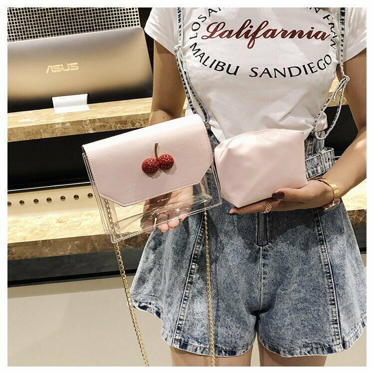 透明とベーシックカラーを合わせた2019夏のインナーゼリーパッケージショルダーポーチ さくらんぼモチーフ レディース ハンドバッグ